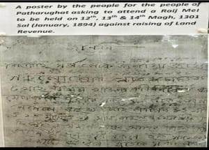 By December 1893 the peasantry in north Kamrup had risen in revolt against the enhanced revenue rates. The village assemblies, known as Raij Mel in Assamese, collectively decided to refuse to pay the land revenue. The peasantry in Darrang soon adopted a similar approach and scattered episodes of violence erupted. In addition, handwritten posters inviting the raij (lit. people) to the village assemblies were pasted in different corners of the villages. Arupjyoti Saikia has translated one such poster in Patharughat. The poster reads: