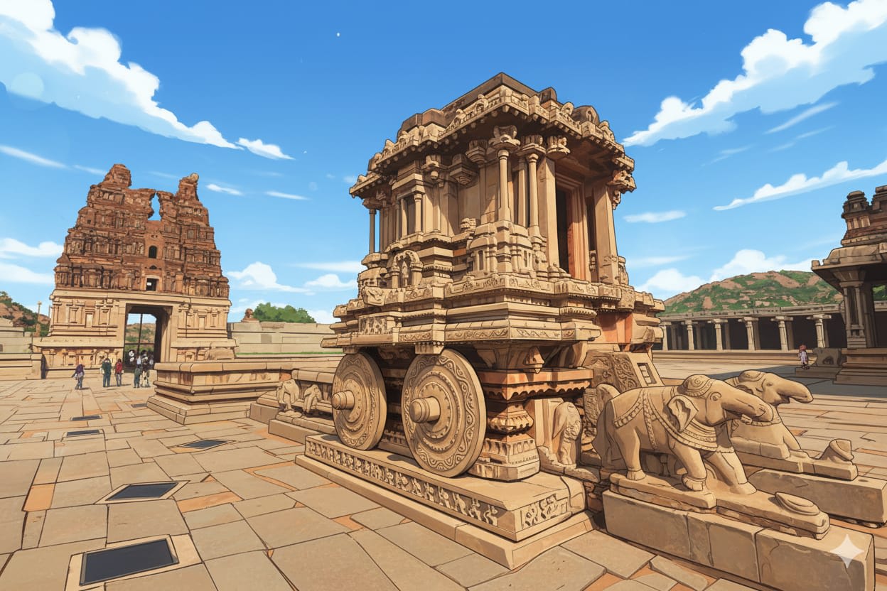 The true soul of Hampi is unveiled in its unique Vijayanagara architecture, a beautiful evolution of the Dravidian style. Stand before the Virupaksha Temple, still alive with devotion, its towering gateway (gopuram) adorned with intricate carvings that breathe life into ancient myths. But perhaps the sparkling jewel of Hampi is the Vittala Temple Complex, where artistry reached its peak. Its most famous feature, the Stone Chariot, seems poised to roll, a marvel carved from a single piece of stone. Even more astonishing are the temple’s legendary Musical Pillars, which, with a gentle tap, are said to sing melodic notes – a marvel of ancient acoustic engineering. And don’t miss the graceful Lotus Mahal, a breathtaking blend of Hindu and Islamic artistry, or the expansive Queen’s Bath, showcasing the empire’s refined taste and engineering brilliance.