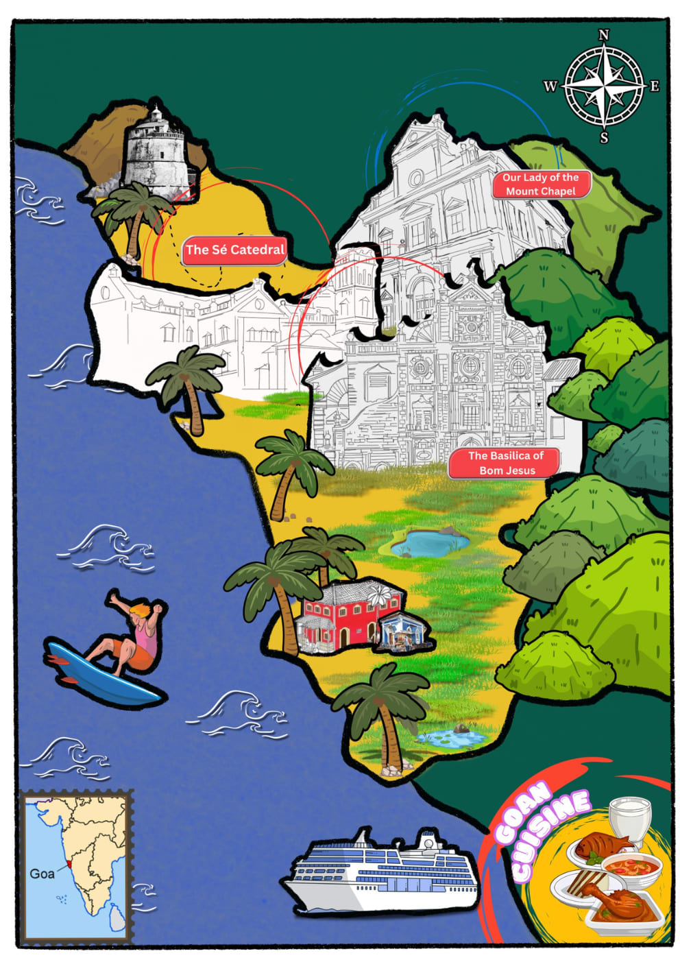 Amongst the many architectural marvels that dot these sceneries, we will focus on three churches that played a significant role in modeling the urban landscapes of Goa which are Basilica de Bom Jesus, Se Cathedral, and Church of Our Lady of the Mount. Each of these structures stands as a testament to unique architectural fusions, conceptualized through ambitious goals of the designers and skilled craftsmen who brought them to life. The weathered stones of each of these cathedrals’ walls have witnessed countless moments of prayers, celebrations, and solemnity.